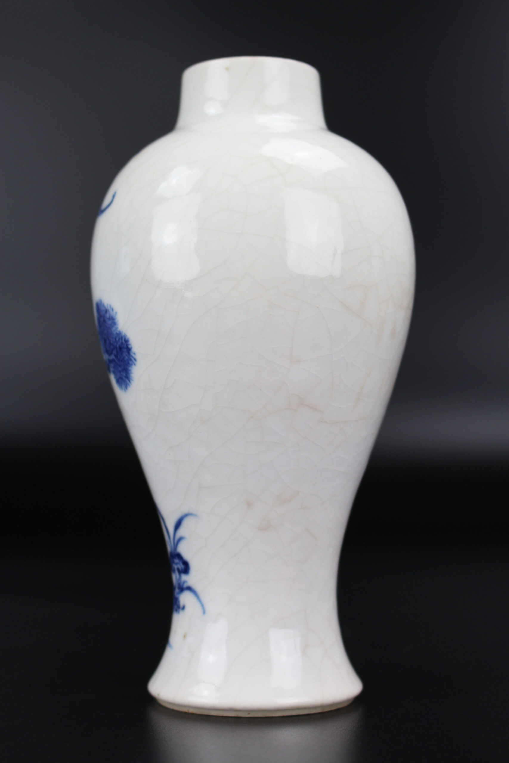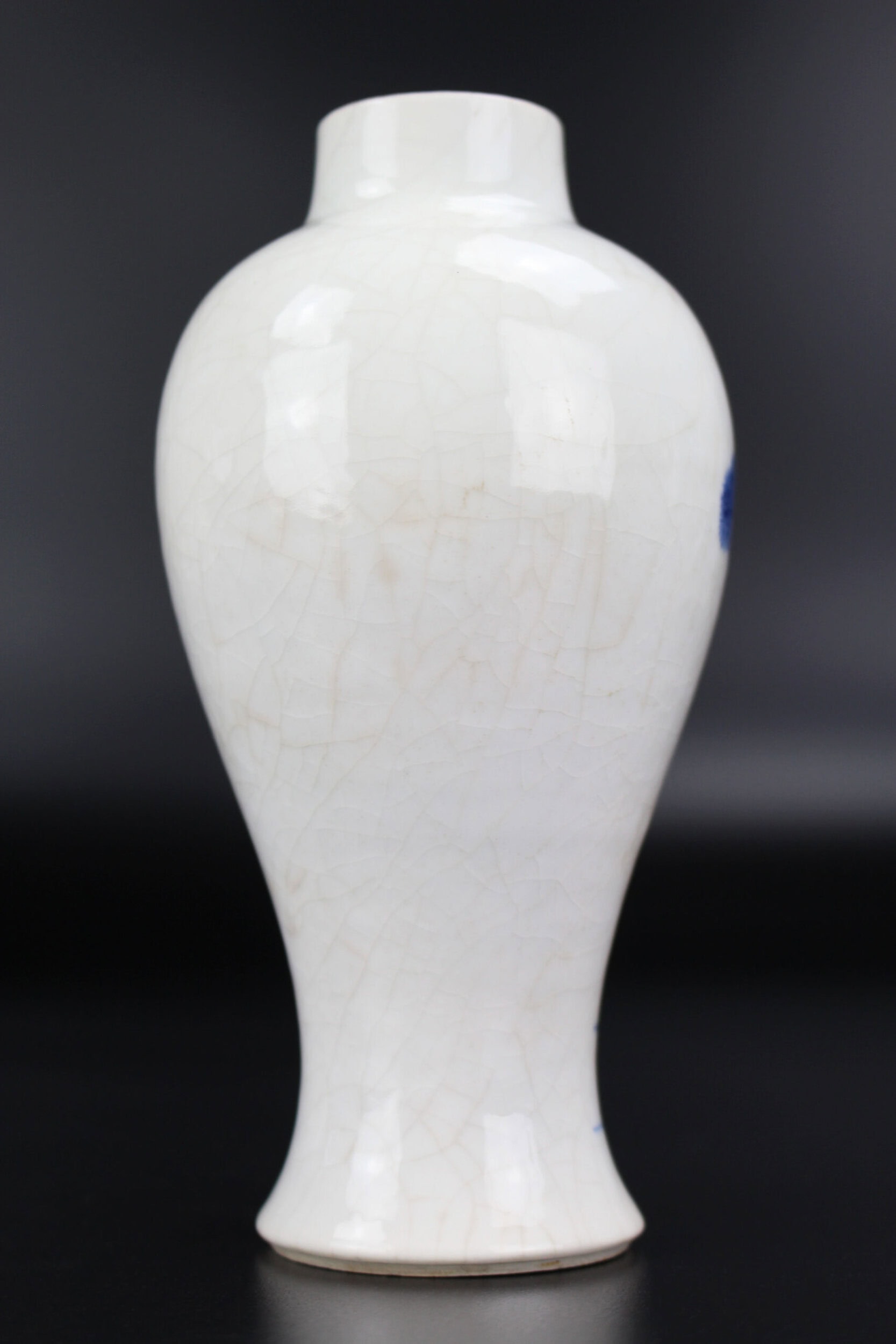 The vase stands on a spreading foot, with the lower section tapering to a narrow waist, rising to a bulbous body and a slightly inward-sloping circular neck. It is finely decorated in underglaze blue on a crackled white ground with a deer standing in front of a pine tree, a fungus growing beside it, and a bat flying overhead.