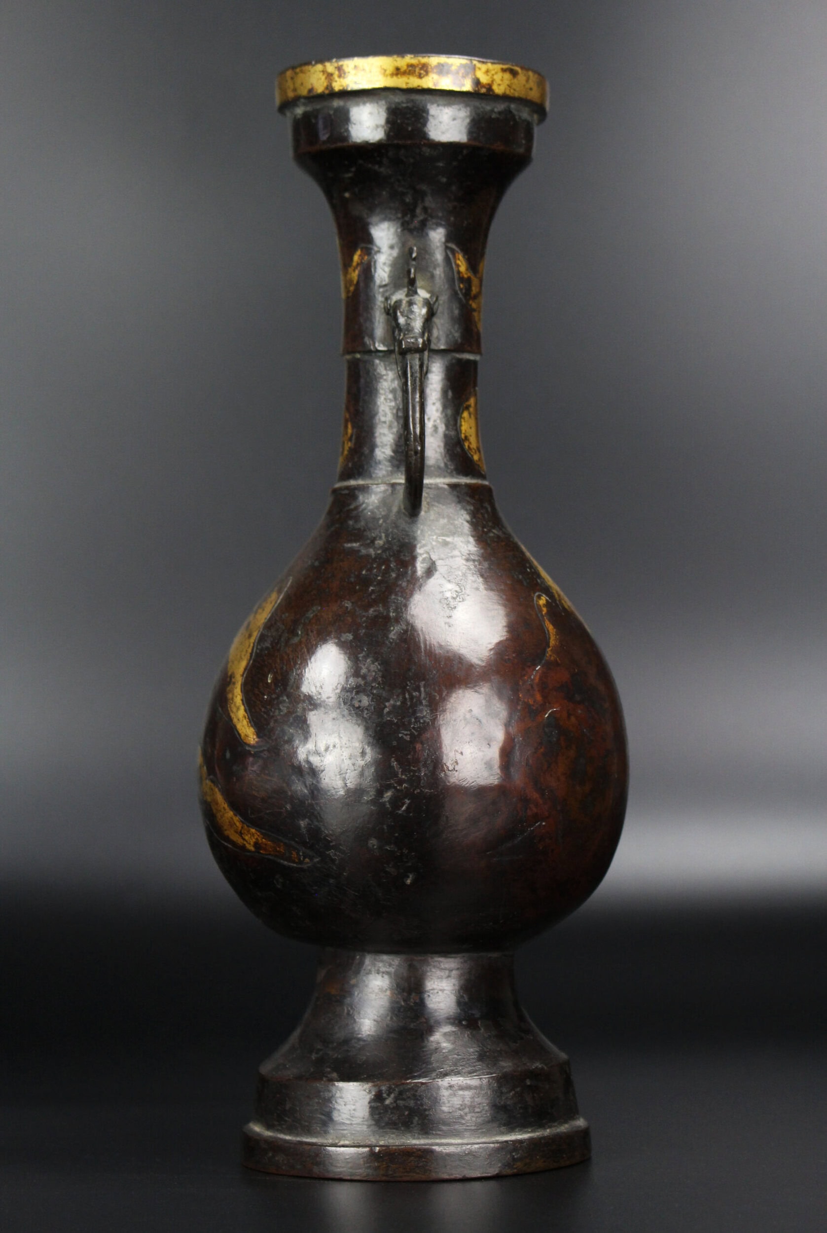 The pear-shaped body rising from a stepped foot to a waisted neck and stepped mouth rim, twin loop handles surmounted by dragon heads issuing from either side. The body with parcel-gilt decoration of mountains, the neck with moons and clouds above, the mouth rim with parcel-gilt finish. The body has a warm, brownish patina.