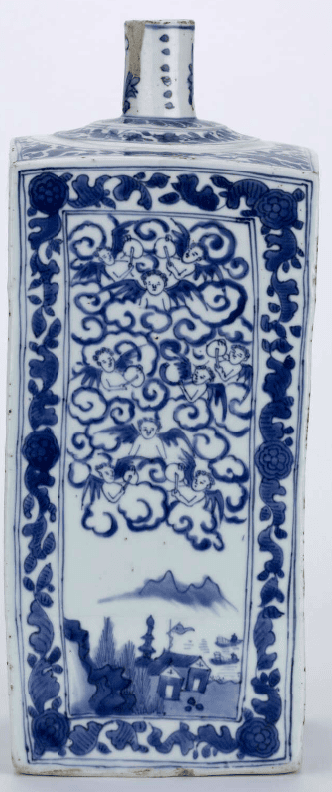 Above: A Chinese flask with symbolic decorations of the death and resurrection of Christ. Featuring a landscape in Chinese style, with angels playing music above. This scene almost certainly represents the angelic choir at the inn of Bethlehem during the birth of Jesus. The decoration is in late Ming style and dates from the early 17th century. The shape is based on a Dutch glass or stoneware drinking flask. However, it is quite possible that this flask was specially commissioned by Portuguese Catholics from their trading post in Goa. The flask was found in India in the 19th century by a British railway engineer. Collection of the British Museum, London.
